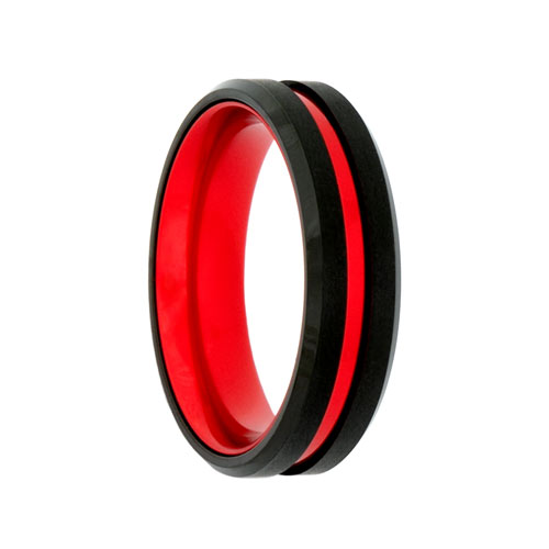 | The Bath tungsten carbide ring features a thin red line that runs along the outside of the ring. The red stripe is framed by a pair of black tungsten rings with a satin finish and beveled edges. The interior of the ring is red making this a fantastic band. |